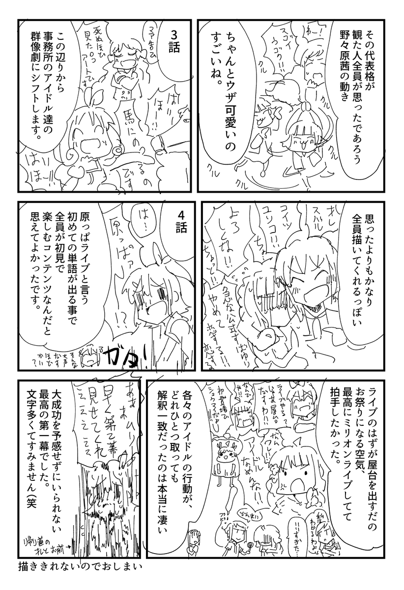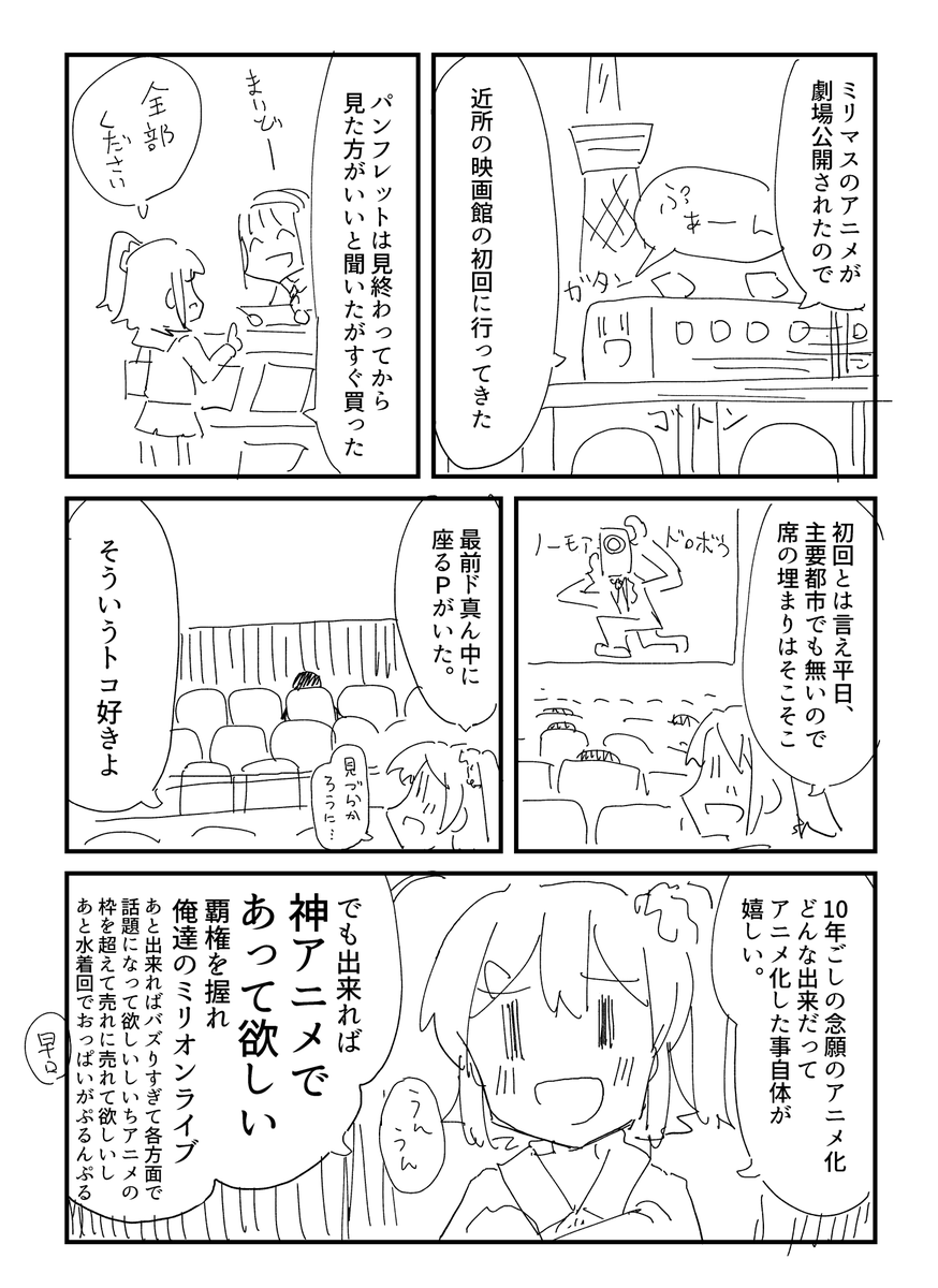 初日に観に行ったミリオンライブアニメRTA完走の感想です。 内容のネタバレに多少配慮してあえて絵を崩しております、あえてね。 #ミリアニネタバレ感想