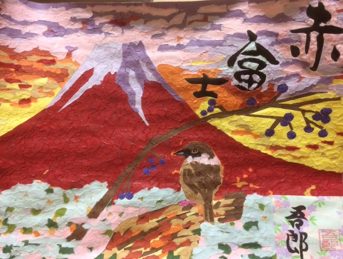無事に赤富士見雀の貼り絵も完成です、 世界で1枚の赤富士と雀 貼り絵 これからも沢山の作品を作ります。 #貼り絵 #雀 #富士山 #赤富士