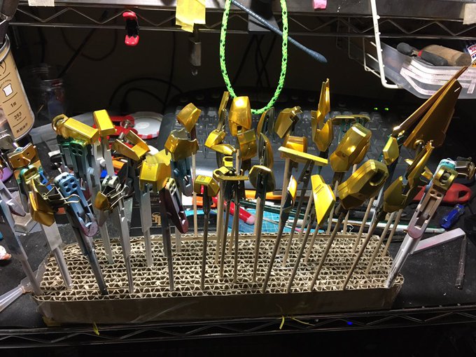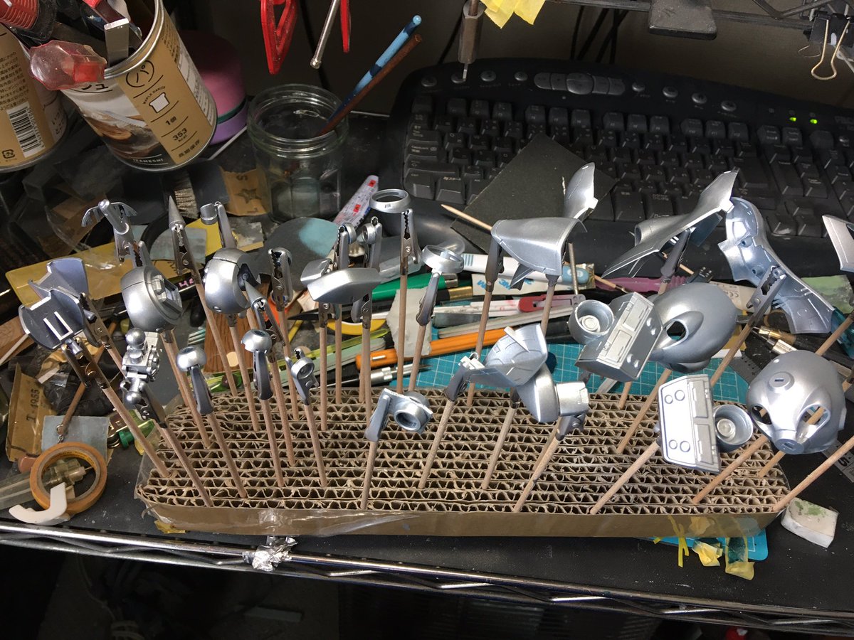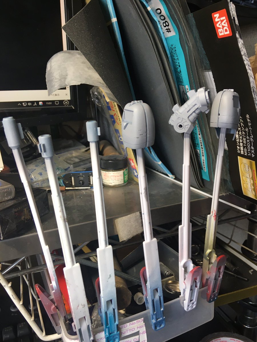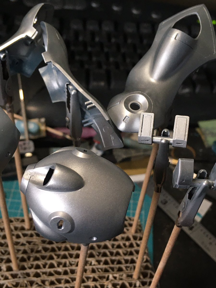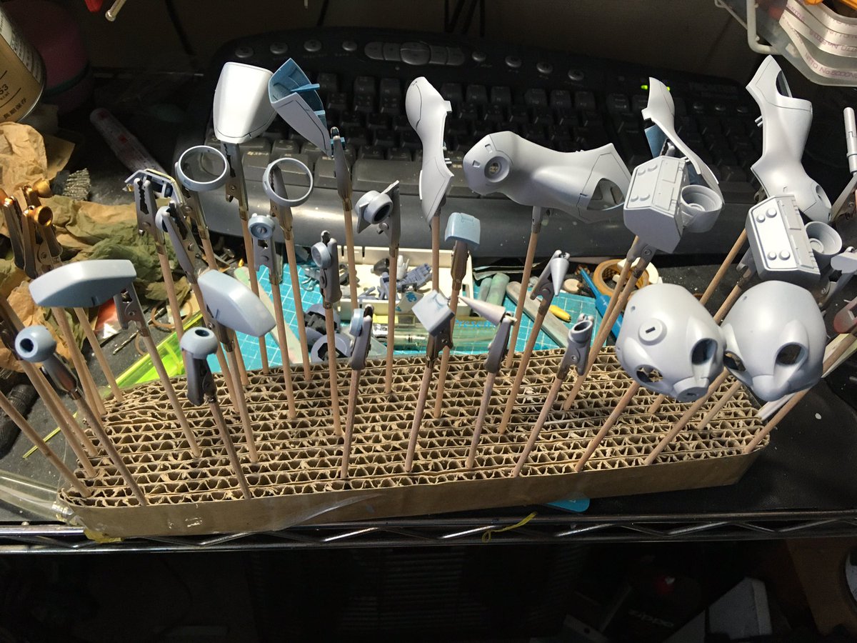 0 1 ケンプファー進捗 外装残りサフ吹き。 まだ加工してないパーツあるから全部ではない。 この後下塗りシルバーから縁どり黒鉄ぼかし→調色したクリアブルーグリーン重ね塗り、とまだまだ工程は沢山。 乾燥待ちの間にスジ彫りやらプラ板加工やらもやんなくちゃ。 さて、組み上がるのはいつ? #ガンプラ 20/04/11 17:52