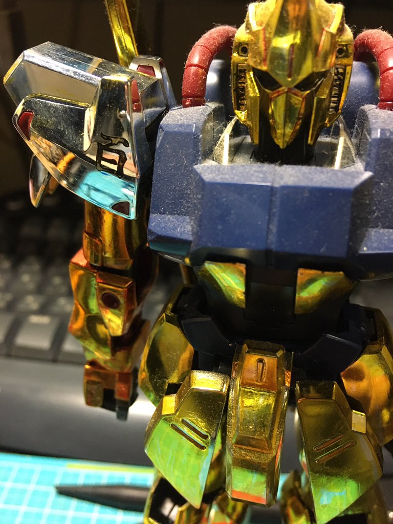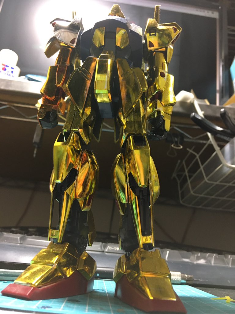 1 3 百式 進捗 胴体が思いのほか軽い色合いになったのでメッキの上塗りを調色。 色々悩んだが少しギミックを仕込んでみた。 蛍光灯で見ればゴールド。 ブラックライト当てると蛍光が反応する。 かなり面白い仕上がりになると思うのでこれでいこうかと。 #ガンプラ 20/04/25 00:28