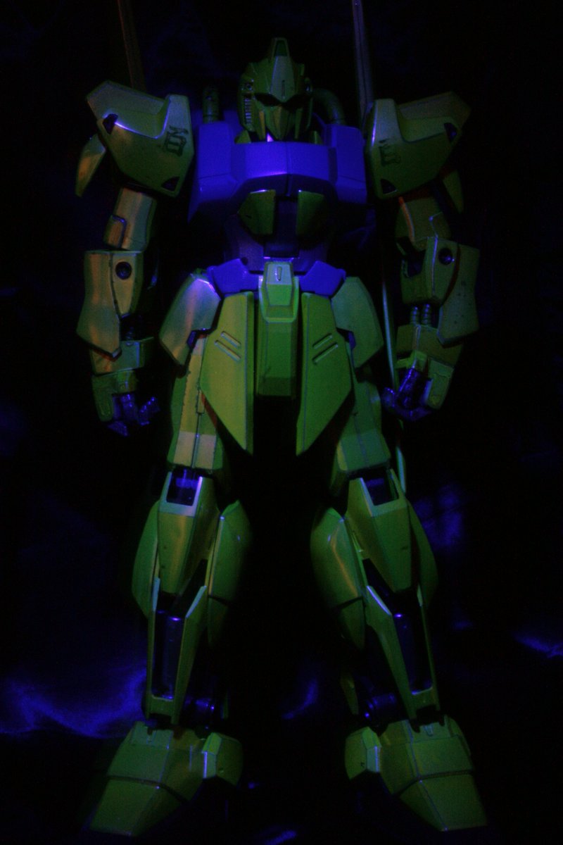 百式 進捗 ちょっと頑張って蛍光灯とブラックライトの比較を撮影してみた。肉眼で蛍光灯だとしっかりゴールドに見えて、ブラックライト(紫外線灯)のみだと金色の部分が蛍光発色して見える。 自己満足のレベルだがこういったギミックのある塗装というのは塗っていってとても楽しい。 #ガンプラ