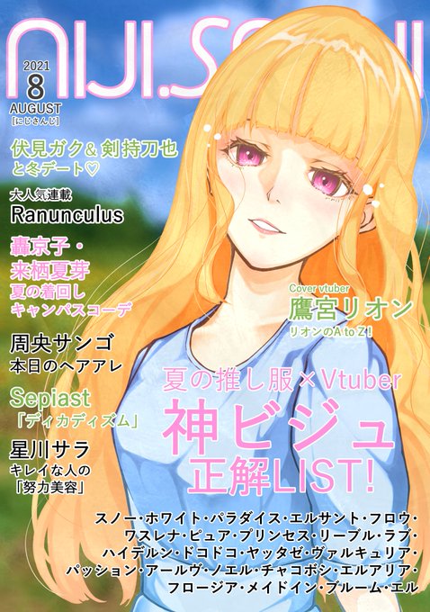 2 14 今月の「NIJI.SANJI」は ポン?なお嬢様の【鷹宮リオン】が清楚パッツンヘアで表紙を飾る! 男装ユニット【Sepiast】の真相とデビュー曲「ディカディズム」に迫る! 服飾ギャルの轟京子と清楚系JDの来栖夏芽が夏休み前の大学生活で使える着回しを紹介! #リオンあーと 22/08/09 19:53