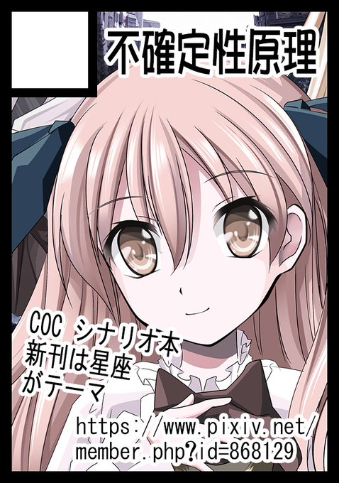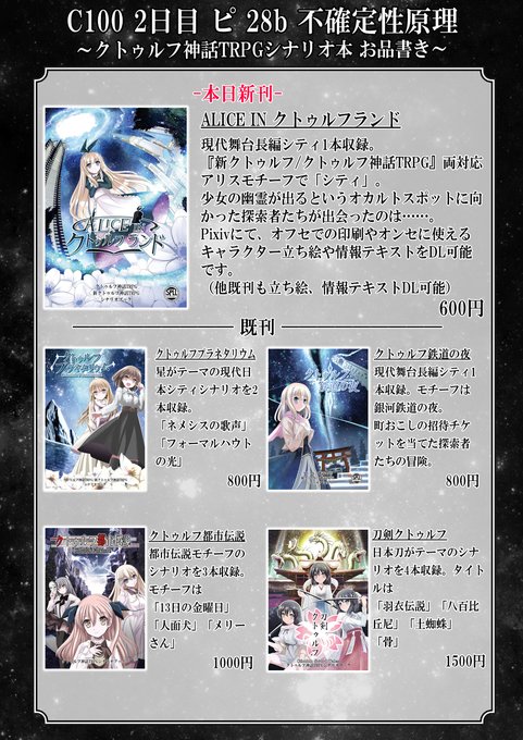あなたのサークル「不確定性原理」は、コミックマーケット100で「日曜日東地区 "ピ " 28b」 コミケ受かりました。 既刊と新刊一緒に持ってきます。 新刊はCoC、6/7版両対応で不思議の国のアリスモチーフ予定。 とりあえず既刊の情報など webcatalog.circle.ms/Circle/1620329… #C100WebCatalog #TRPG