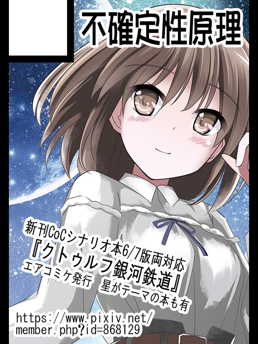 #C101新刊 #CoC #シナリオ集 コミケ101 1日目12/30 Q-27a 不確定性原理 新刊告知 普段行ったことがないように行けるシナリオを三本収録です 6/7版両対応 pixiv pixiv.net/artworks/10383… メロンブックスさんで予約開始中 melonbooks.co.jp/detail/detail.… 後ほどBOOTHでも電子書籍版出します (1/5)