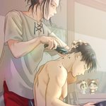 リヴァエレ祭り27 エレン誕までネタが続くかちょっと心配になってきた。 以前の絵をトリミングして再加工。 リヴァイさんの髪のお手入れも大事だけど、あんたのそのむさくるしい頭をどうにかしなさい!とカルラママに小言を言われてそうなエレン