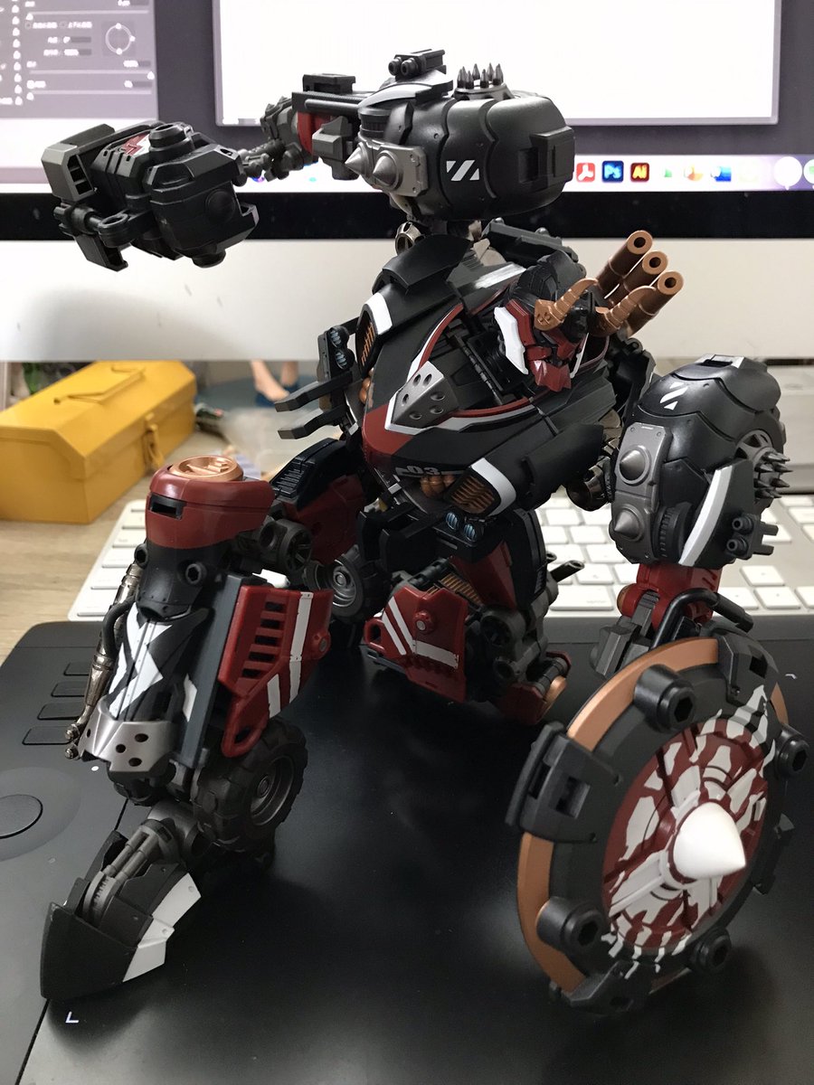 核誠治造の影虎、組み替え変形は想像してたよりシンプルな構成なので一往復すれば覚えられる。ビークル形態は要所を固定するのでかなりカッチリしてる。コロ走行もスムーズ。余剰パーツも目立たない場所に付けておける。良き。