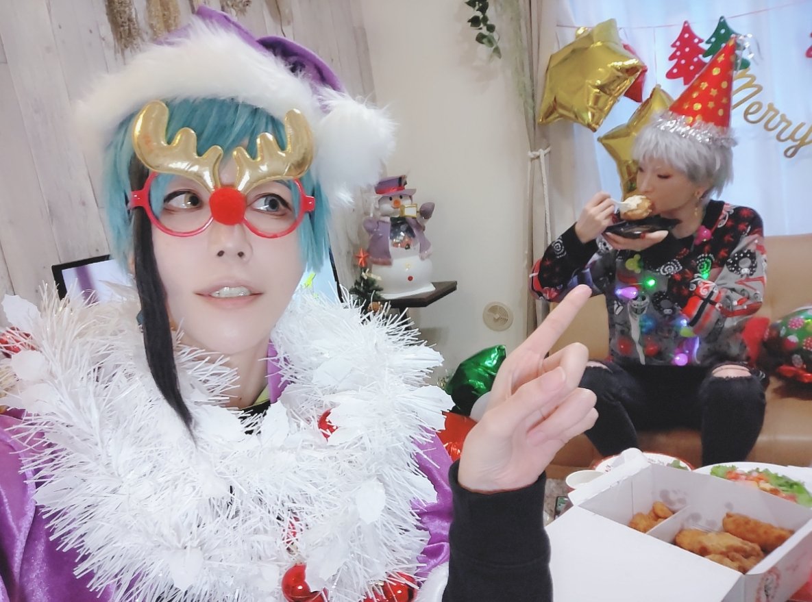 2 13 【コス写】※私服捏造 こちらはクリパで浮かれ気分全開の🦈と、めっちゃ光ってるしモリモリ食べてるの可愛い🦦ちゃん 21/12/25 21:35