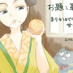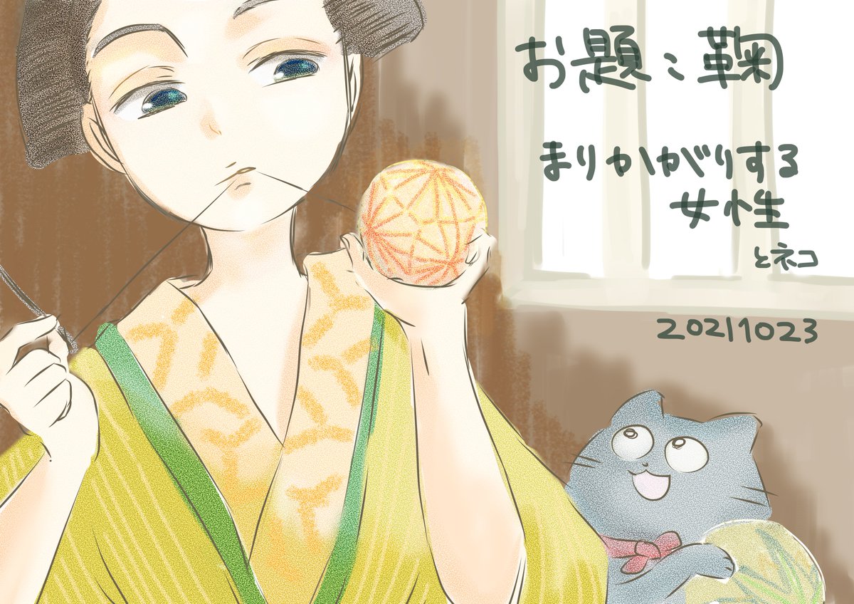 #歴創版日本史ワンドロワンライ お題:鞠で参加します! 喜多川歌麿の作品(婦人手業拾二工・まりかがり)を参考にしていますが、私の好みの顔の角度に変更させていただきました。 あとネーコを追加。鞠と猫の組み合わせは無敵=^_^=