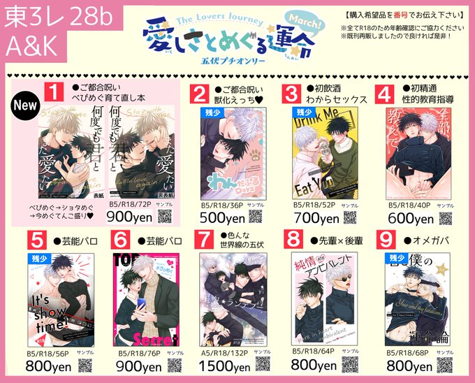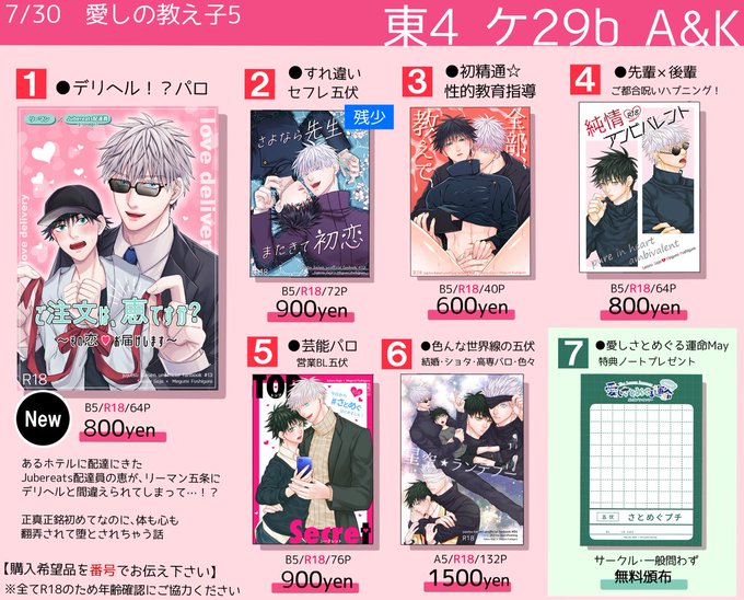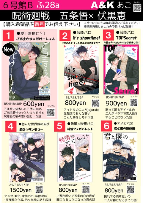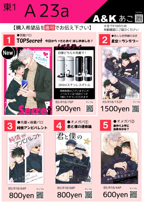 5/3 スパコミ 超妖言2022 愛しの教え子2(五伏)お品書きです。 【東1 A23a /A&K】でお待ちしていますので、どうぞよろしくお願いいたします🙇 新刊サンプルはツリーへ繋げます🌲 その他既刊サンプルは🐯でご確認いただけます↓ ec.toranoana.jp/joshi_r/ec/cot…