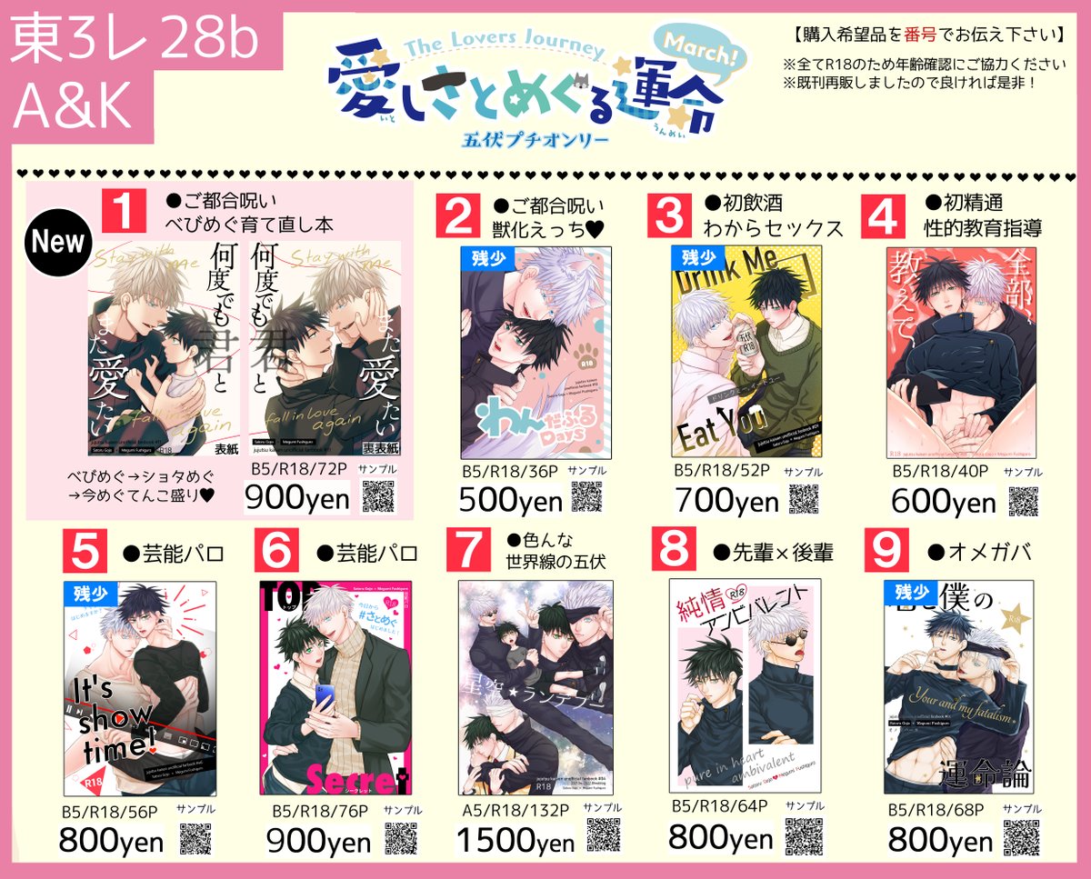 3/19 春コミ 愛しさとめぐる運命 March お品書きです! 【東3 レ28b】の五伏スペースで皆様に会えるの楽しみにお待ちしてます🙇 当日はどうぞよろしくお願いします💕 通販🐯:x.gd/4yh2I #0319愛しさとめぐる運命_お品書き #さとめぐプチ