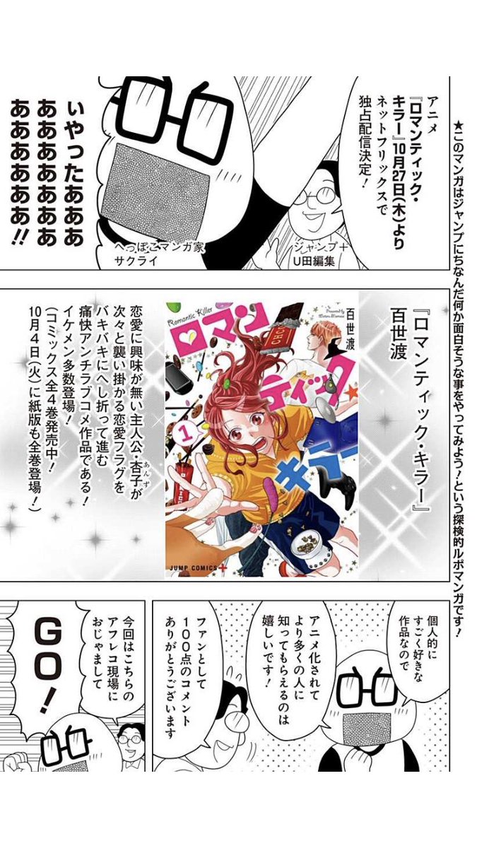 改めてまして… へっぽこ探検隊!最新話更新! アニメ『ロマンティック・キラー』の アフレコ現場におじゃまして来ました! 原作者の百瀬先生も登場! 色々聞いちゃいました! アニメ『ロマンティック・キラー』は 本日よりNetflixにて配信開始!みんなで観よう! shonenjumpplus.com/red/content/ec…