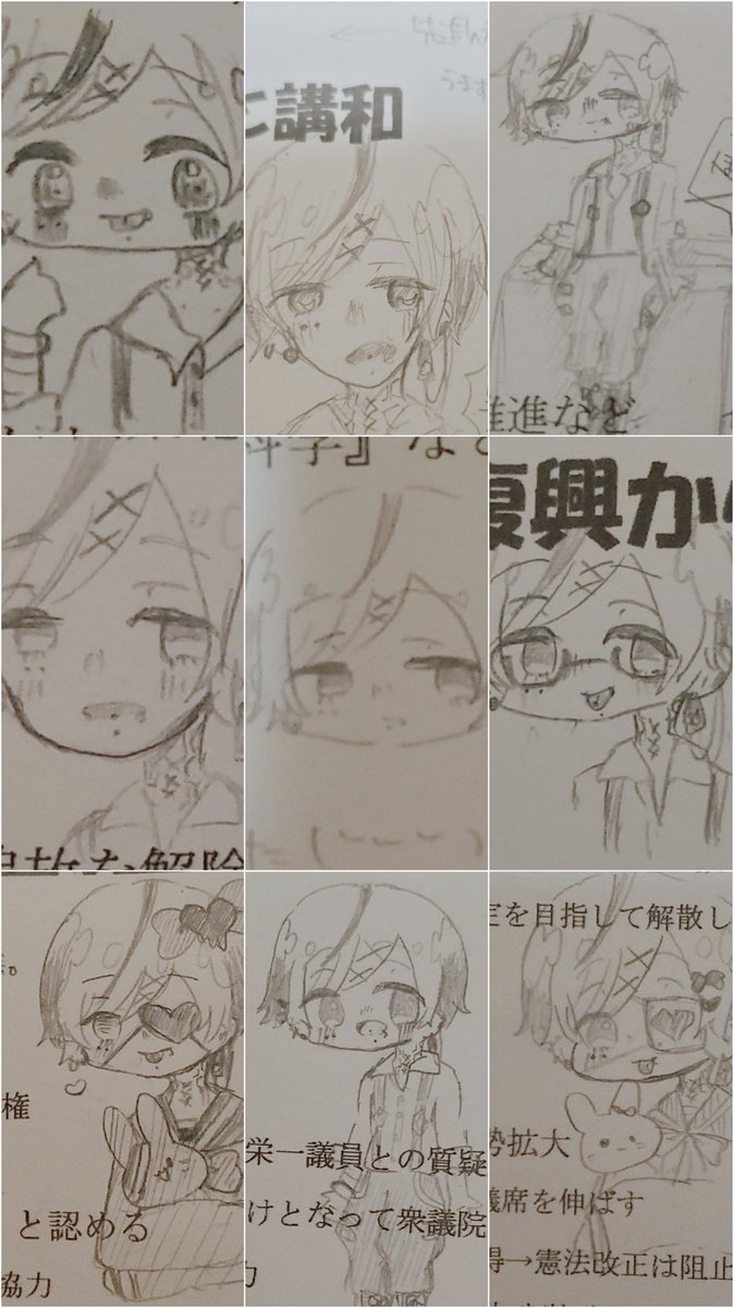 日本史のプリントを片付けていたら出てきたので供養🙏 1番左上が初描きで、1番左下が最後でした。絵柄安定しないマンだからその時によって全然顔が違う...。 #堕落他撮り