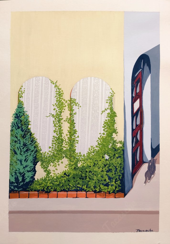 回廊のある建物・5月の朝 #イラスト #アクリル画 #建物 #窓 さぁ、雨戸を開けて。 新しい一日が始まりますよ。