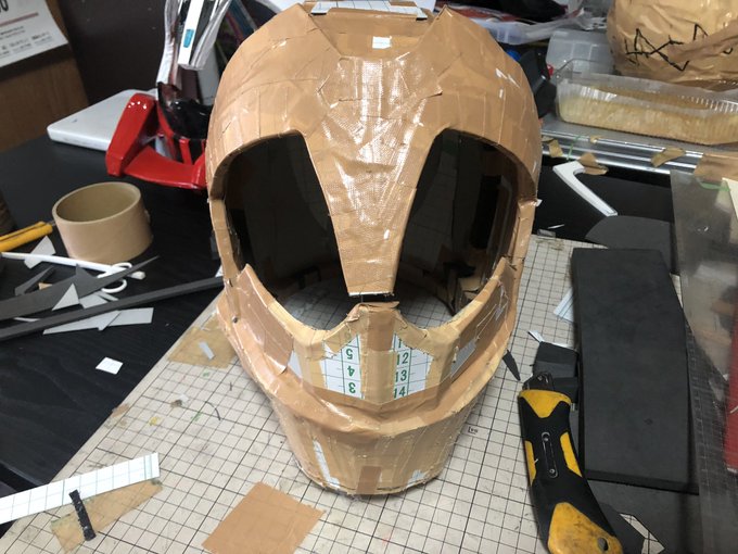 昨日のペースは維持できなかった…( ˘ω˘ ) 今日はバランス調整に費やしました。 ひらパーのショーで撮影したデッドヒートマッハのマスクと同じ角度で見たときに違和感がないか確認し、切った張ったを繰り返し。 これまで培った技術すべてぶち込んで最高最速で製作します #デッドヒートマッハ製作