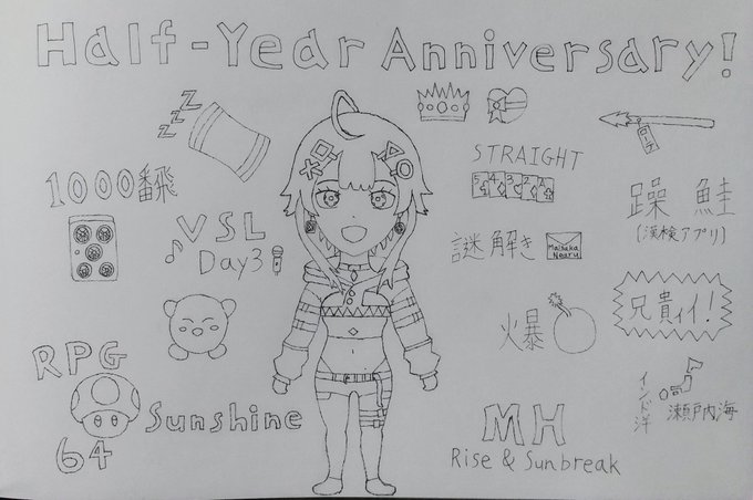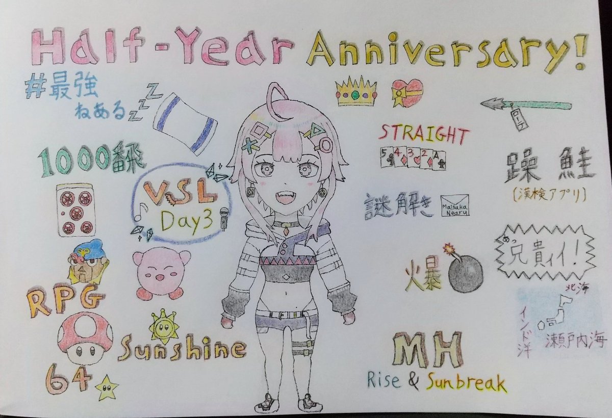 @maisakanearu ねあるん、昨日のVSLお疲れ様。 今日の16時からの記念配信、楽しみにしてるね。 今までの配信全部は描ききれなかったけど、よかったら見てね。 半年おめでとう! #ねあるあーと