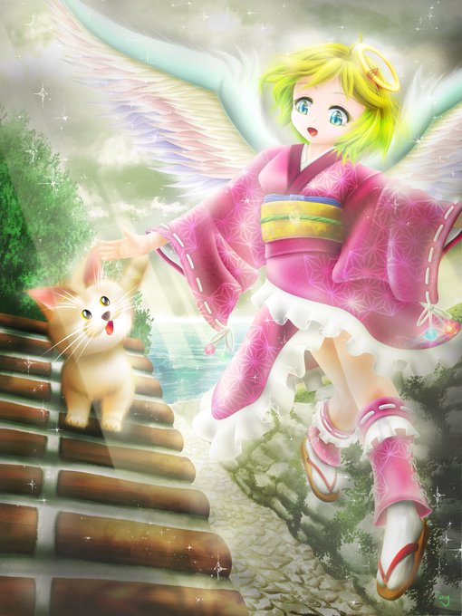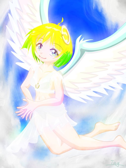 🌞🌴初夏に向けたイラストのwip🍉🌻 うちの子天使みーちゃん👼 カラーラフの段階ですが、思ってたよりイイ感じになってしまったのでアニメ塗り版として載せちゃいます😅💦 #たじの落描帳 #オリジナルイラスト #創作イラスト #アニメ塗り #絵描きさんと繋がりたい #AdobeFresco