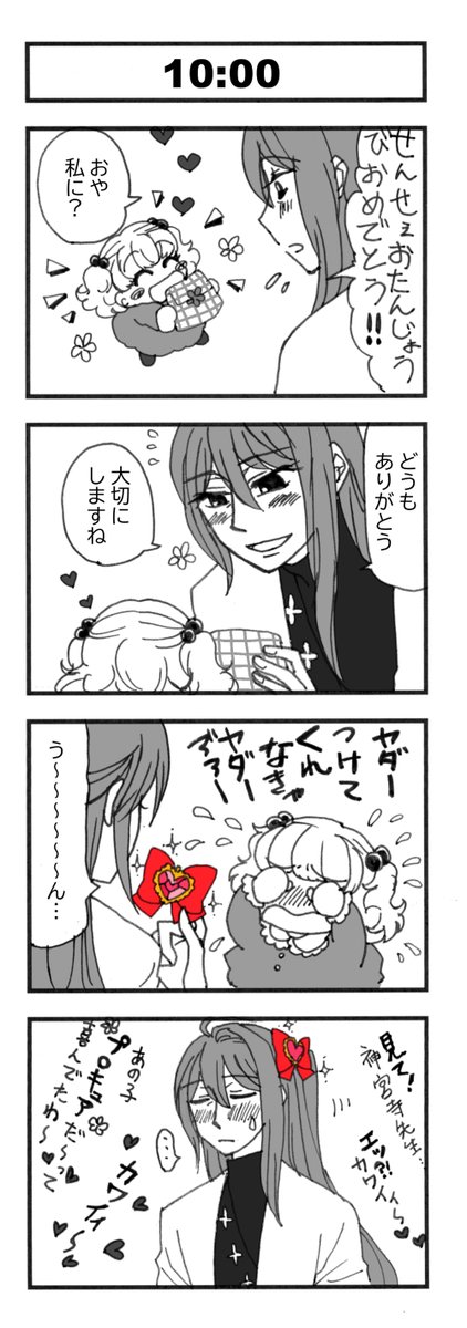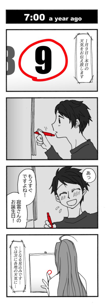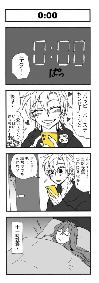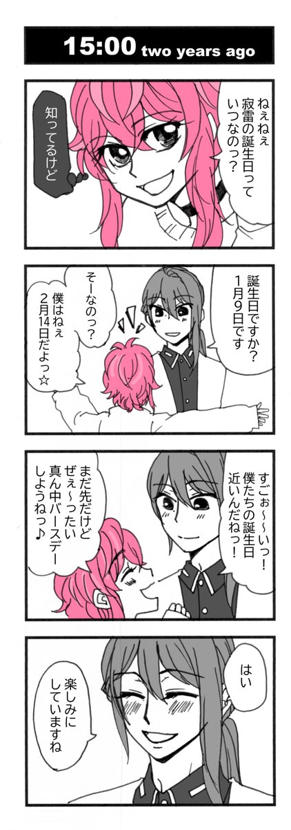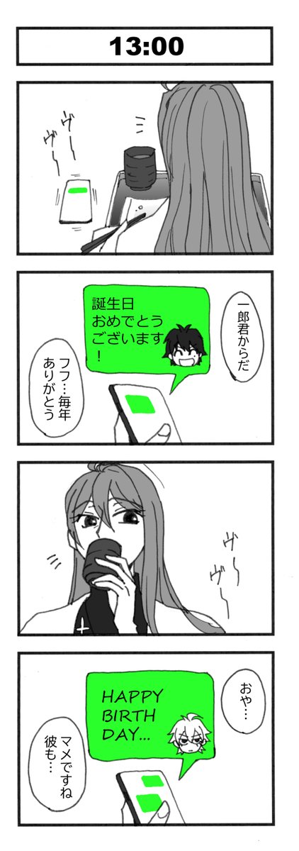 寂雷先生!お誕生日おめでとうございます! 新しい年も、貴方の幸せを祈らせてくださいね。 というわけで、『誕生日にまつわる思い出』がテーマのお祝い4コマ漫画劇場、始まるよ~♪ (時間になると続きが予約投稿されます。全部で9本あります。本日中に全て見れます)1/9 #神宮寺寂雷誕生祭2022