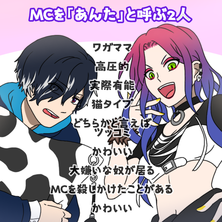 「あんた」組と勝手に呼んでます 💜面倒臭いけど「あんた」が行くなら僕も行く 💀「あんた」にだけ特別に見せてあげるわ! #obeymefanart #obeymebelphegor #obeymethirteen ワガママ 高圧的 実際有能 猫タイプ どちらかと言えばツッコミ かわいい 大嫌いな奴が居る MCを死なせるところだった かわいい