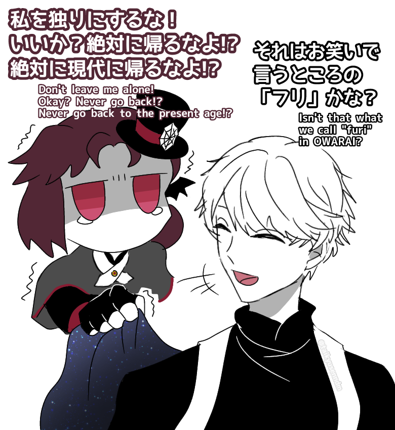 恋に恋するMCと他意の無い六男 ベールが食べてるのは🦑2の屋台メニューです #obeymebeelzebub #obeymefanart #obmプラス I used Google Translate and +α