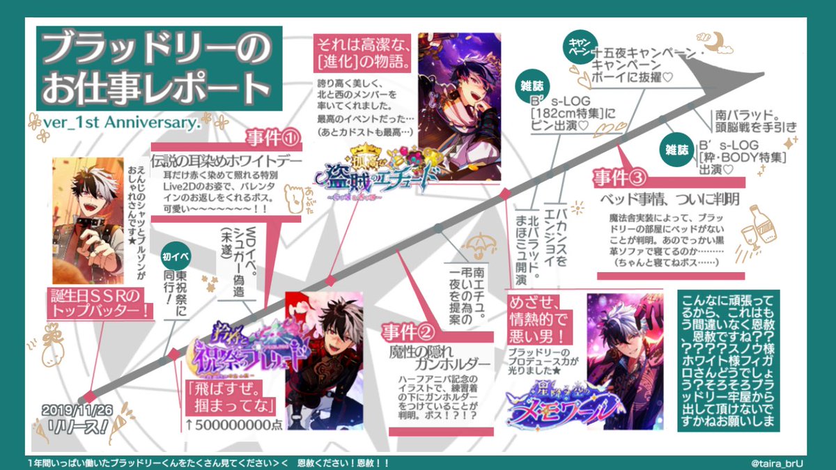 497 1470 我らがボス・ブラッドリーの、1年間の活躍ぶりをご報告します🎉 魔法舎のため、世界のため、(恩赦のため)、たくさん働いてくれたブラッドリーをいっぱい褒めてください!!! ⬇️ツリーに恩赦アンケ⬇️ #まほやく1周年 20/11/26 00:01