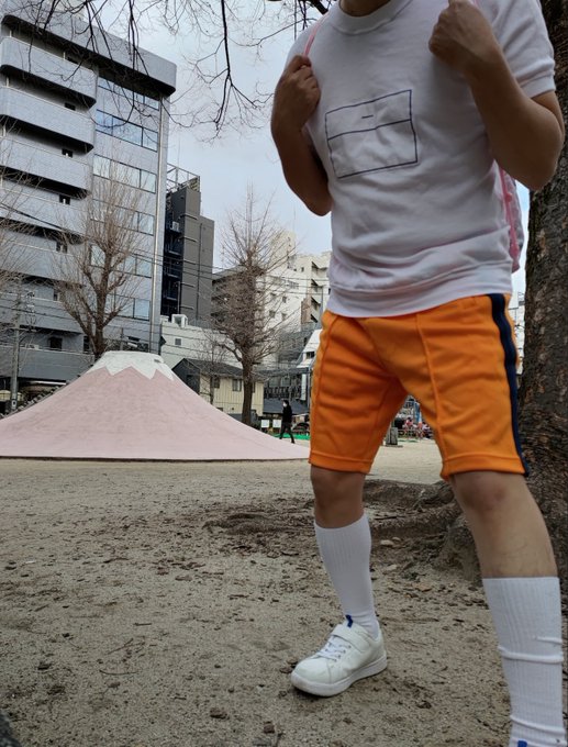 0 4 Standing in the park in white short-sleeved gym clothes and orange shorts. There is a slide like Mt. Fuji behind. (※英語での投稿テストです) #Cosplay #Selfie 22/02/08 04:38