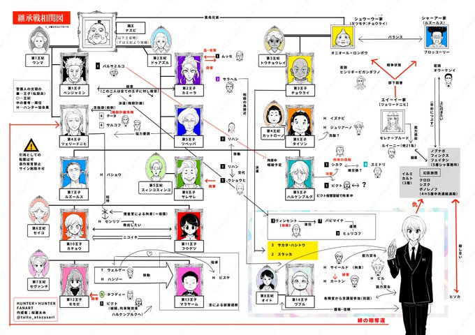 お待たせ致しました。オンリーで配布したテスト版の相関図に修正加筆した継承戦編相関図になります。 🆖自作発言、サイン消し、公式と混合されるような行為は禁止致します。 原作に対し迷惑にならないよう敬意を払って頂ければと思います。 #hxhfanart ツリーにてネップリ番号を記載していきます↓