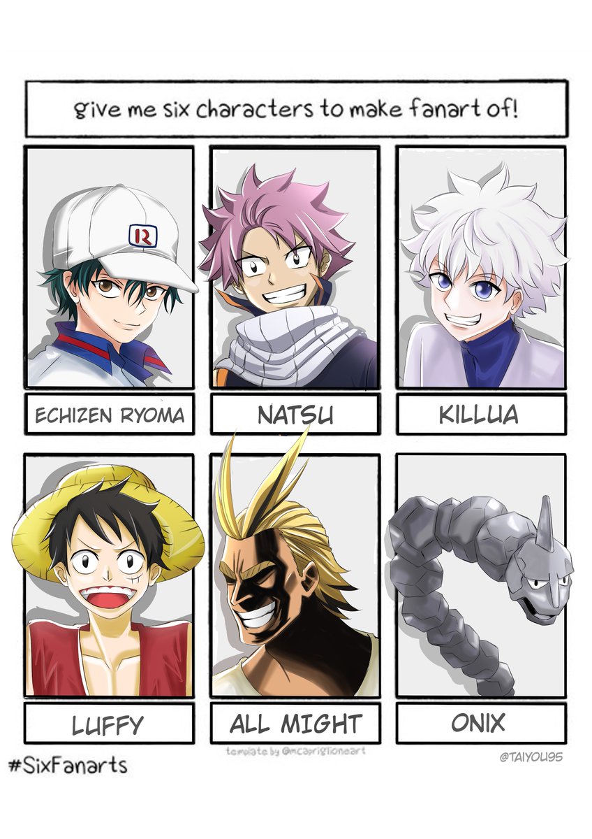my #SixFanartsChallenge finally done. I Got all suggestions from my IG. Making this consumes so much time :") but no regret! So, I'll not draw for the next 2 days. Maybe. Cause I need to rest my eyes. 🤓 #SixFanarts #echizen #natsudragneel #killua #Luffy #AllMight #onixpokemon