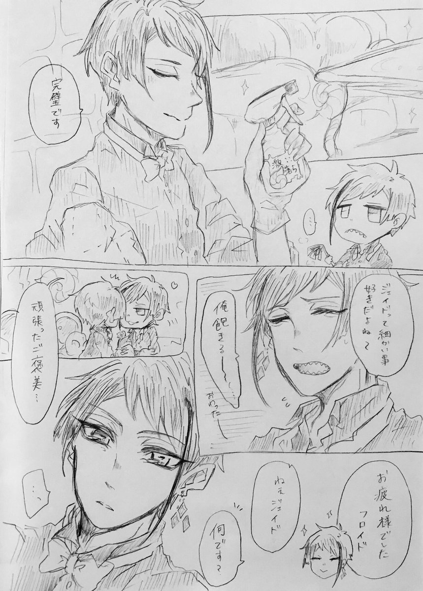12 93 ※ジェイドがコロコロ表情変わります ※フロイド→→←←ジェイド両片想い(のつもりだった) ※アズールを描いてみたかった ※背景など存在しません。。。 最終的にはフロジェイのイチャイチャえんどです🦈🐬✨(1/3) 20/05/25 02:17