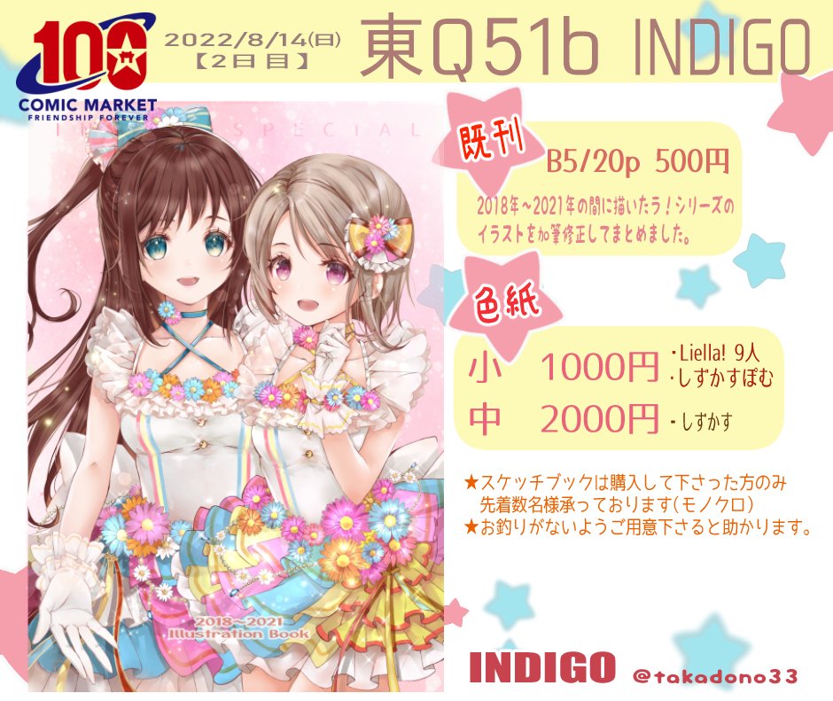 10 26 大変遅くなりました🙇♀️明日のお品書きです。新刊は10月1日の虹ちゃんオンリーで!…スミマセン🙇♀️いざべゑさん(@izaberu0925 )のしずかす小説本も委託しております。色紙は描けたら載せていきます。明日はヨロシクお願い致します🙇♀️ #C100 22/08/13 21:03