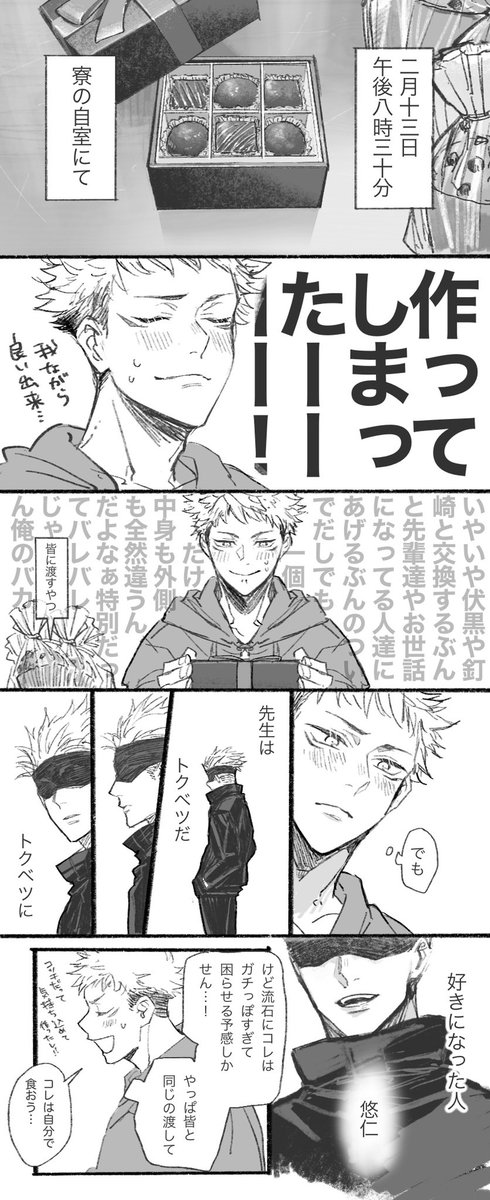 バレンタインの五悠になるはずだったもの を夜中に供養しちゃう この後ごじょ先生がやって来て、ごじょ先生からもゆじぴの本命チョコが欲しいってねだって、なんだかんだちゃんと本命として渡せたって流れになるはずだった 最後まで描ききれず無念…!でもゆじぴのめっちゃ可愛い顔描けたのは満足!