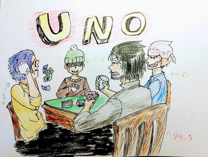 0 4 仲間たちとUNO 下の黒はソニーレイ的な感じですw (決して足描くのが面倒いなんて言 えない😅) #落書き #UNO #色鉛筆 21/04/25 11:16