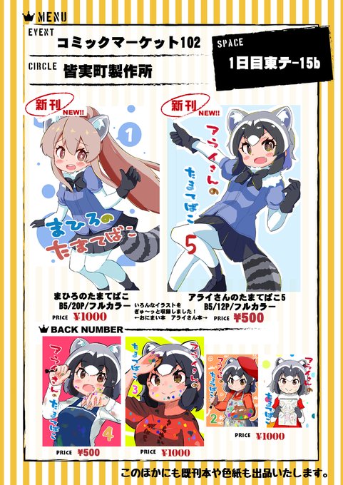夏コミのお品書きです!今回はなんと新刊が2冊! アライさん本とおにまい本を用意いたしました! このほかに色紙も出品しますので楽しみにして頂けたら幸いです。 8月12日 1日目 東テ-15bでお待ちしています! #C102 #C102お品書き