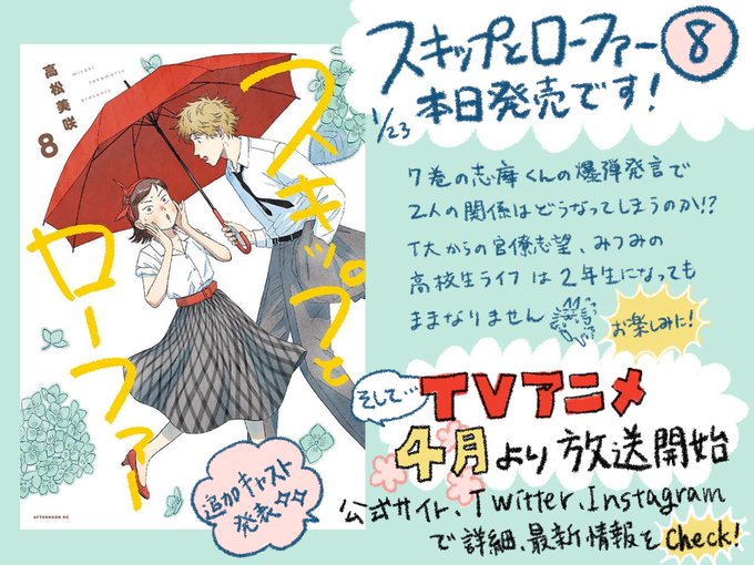🌸スキップとローファー⑧巻🌸 ✨✨本日発売です✨✨ アニメ(@skip_and_loafer)4月放送スタート! 追加キャストも発表されました😭 よろしくお願いします! #スキップとローファー #スキロー ↓Amazon📦↓ amzn.asia/d/5XqyS1J ↓各種書店情報📖↓ kc.kodansha.co.jp/product?item=0…