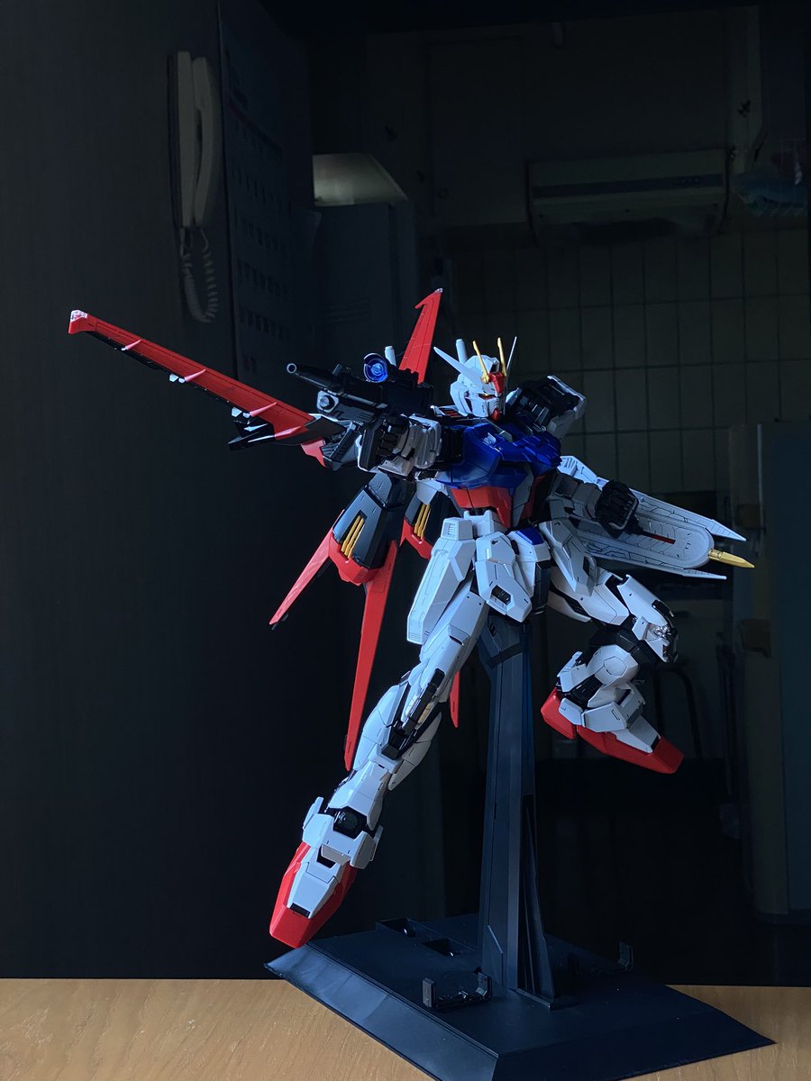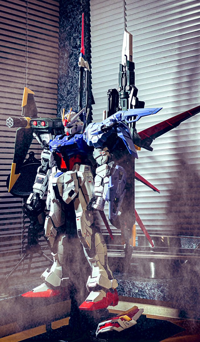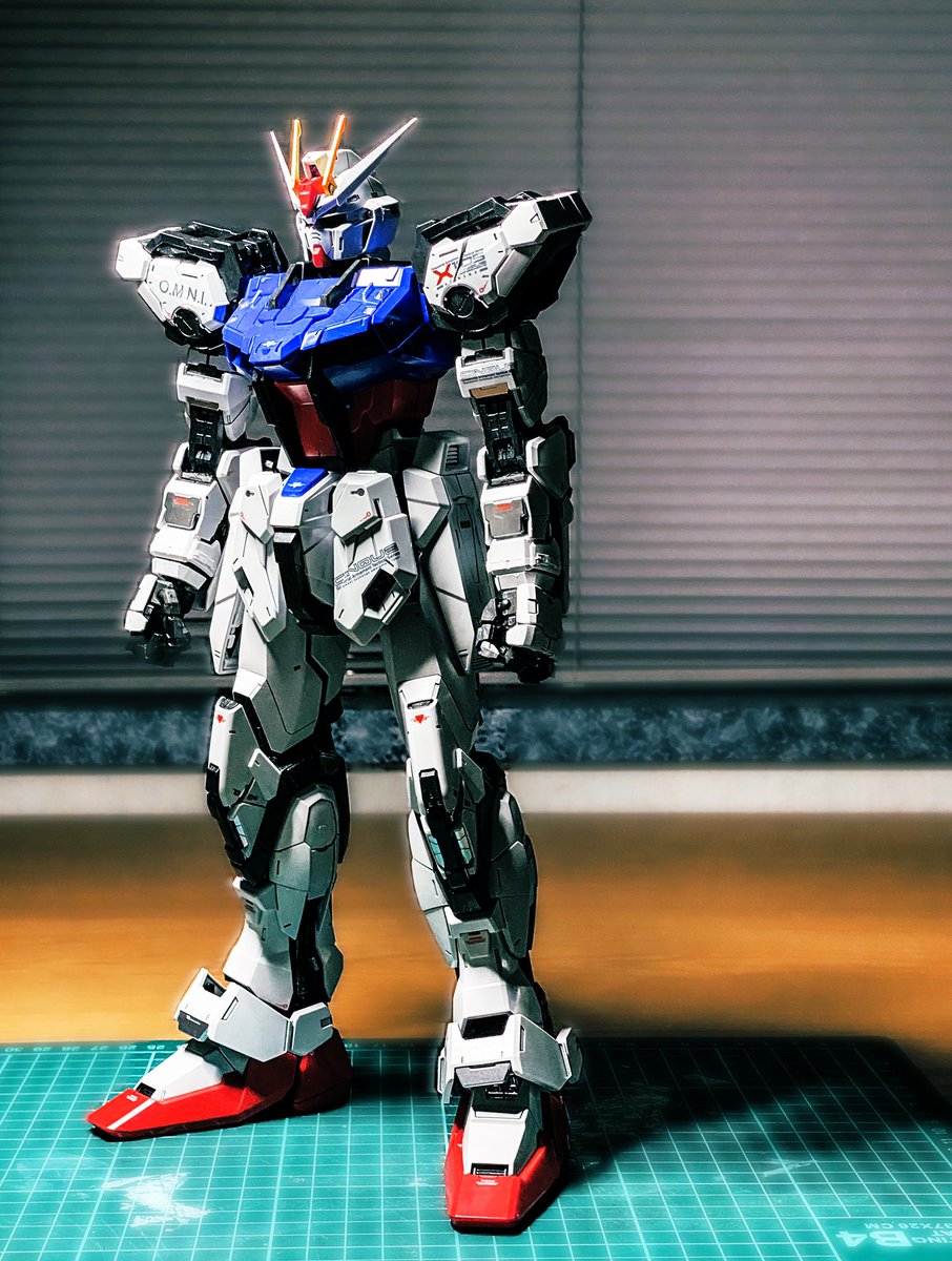 箱絵風パーフェクトストライクガンダムです。 火花出すとこでテーブル焦げましたが問題ありません。 #ガンプラはどんな自由な発想で作ってもいいんだ #ガンダムSEED #ガンプラの画像貼るとRTされると聞いて #ガンプラ好きと繋がりたい