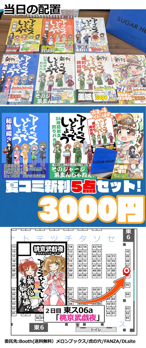 46 89 ◎あなたのサークル「桃京武戯夜」は 日曜日 東地区 “ス” ブロック 06a に配置されています。 夏コミのスペースいただけました!!アイマスどうでしょうもいよいよシリーズ第10弾!新作をお届けできるようがんばります🙇♂️ 恒例の紙袋や見聞録本も作りたいです。よろしくお願いします~!( * ` ▽ ´ ) 23/06/09 20:44