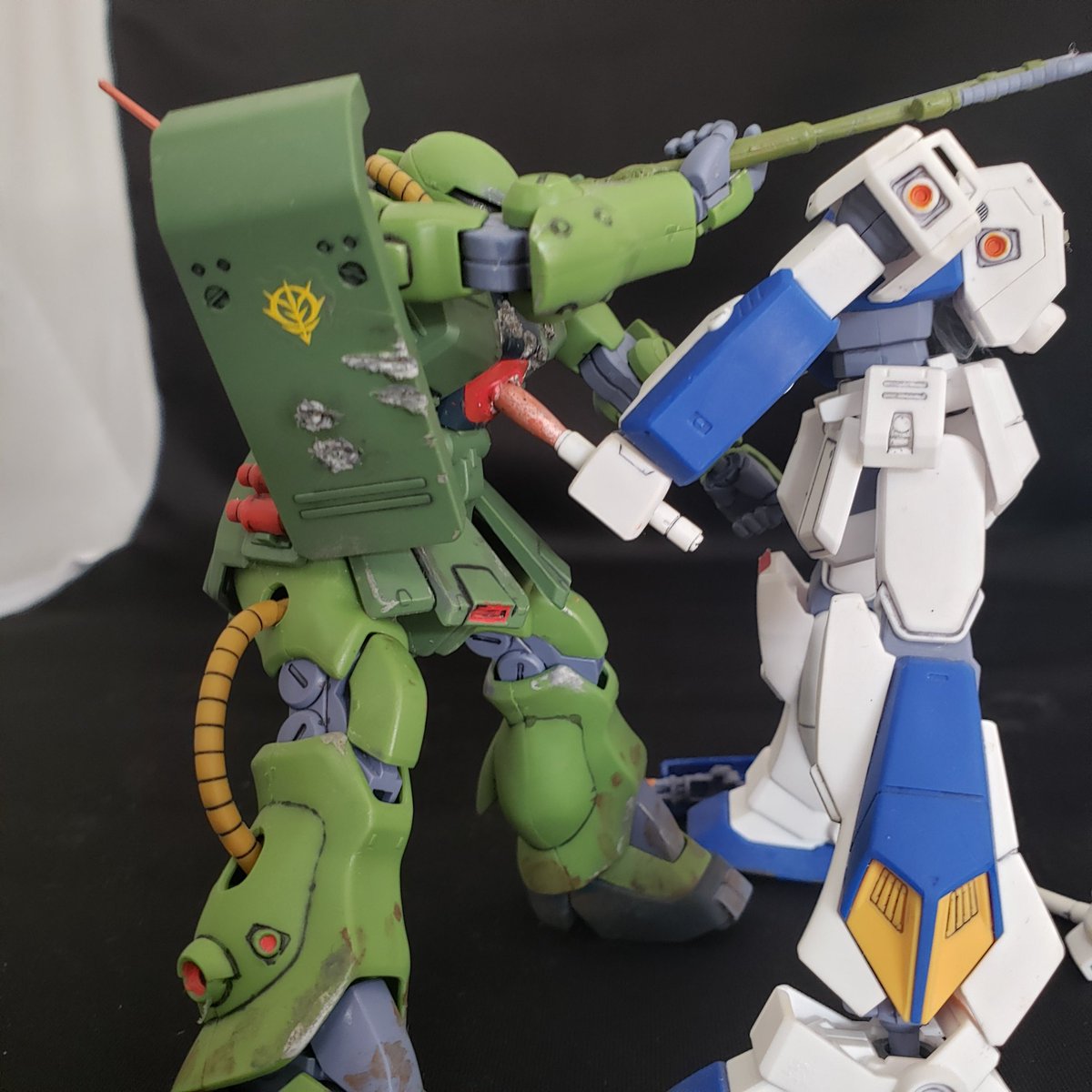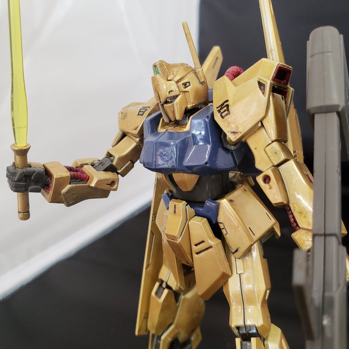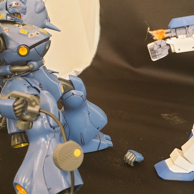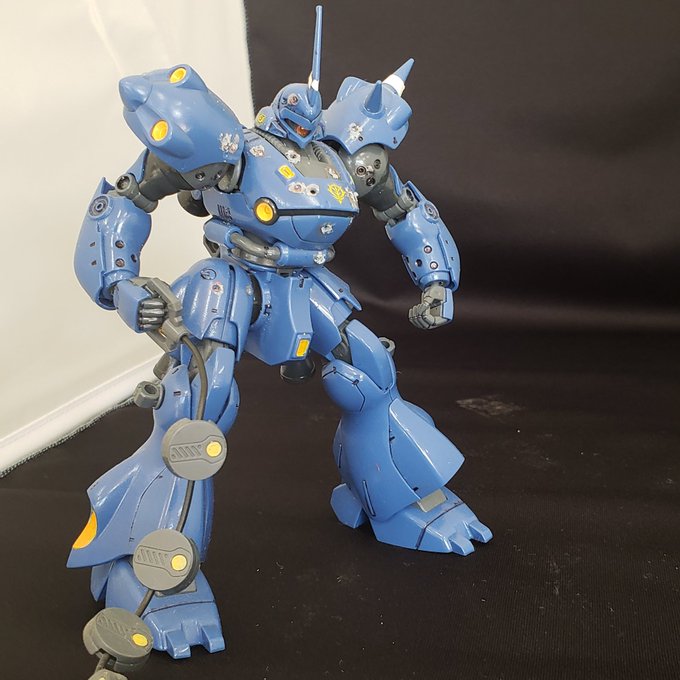 お次はケンプファー、アレックスのガトリングで打たれたところを再現したつもり、新型機と言うことで光沢コート&スミ入れ仕上げ! 昔の方が気合い入ってんな‼️ #ガンプラの画像を貼るとRTされると聞いて #HGUCケンプファー