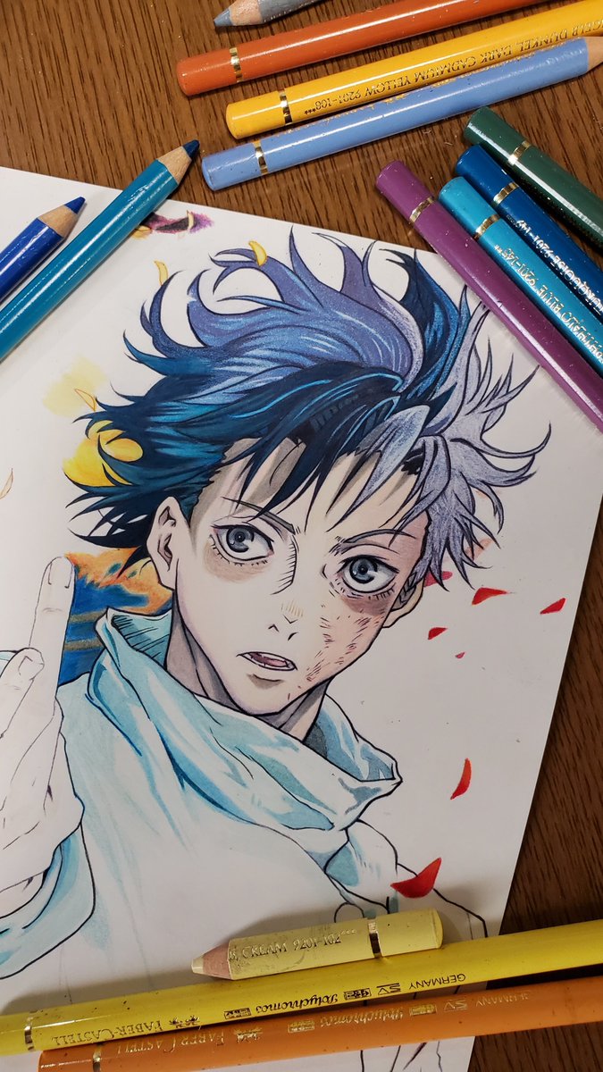 色鉛筆で五条先生描きました 無領空処のシーンかっこいい! #呪術廻戦 #模写