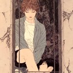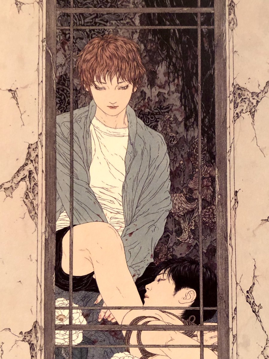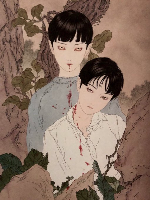 68 414 感傷的な金色の光を微かに浴びて 静かに溶けて消えた少年の面影が 永く閉ざされた廃園の樹々の間を彷徨っている。 一足ごとに密やかに。 「少年幽鬼図・たまゆらに / Vampire・For a Fleeting Moment」 2021年 Acrylic on paper 23/05/28 12:01