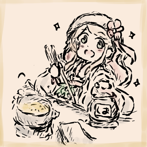 『今日は ふきのとうの天ぷらですよ~ 最後に仕上げにお塩をぱらぱらと・・・』 #式姫お絵かき60分一本勝負