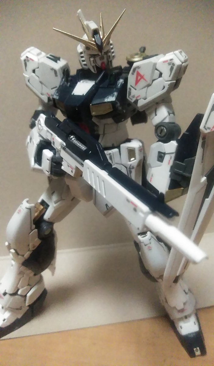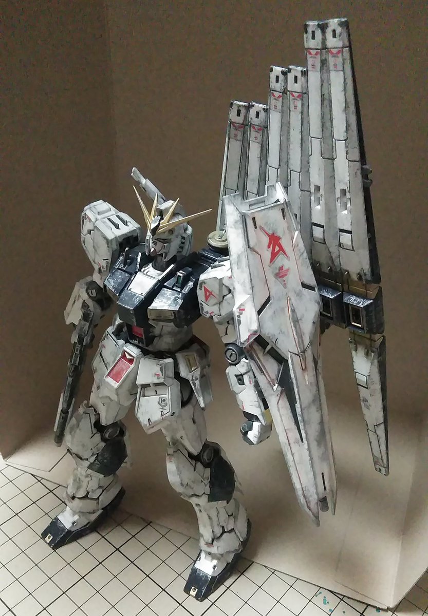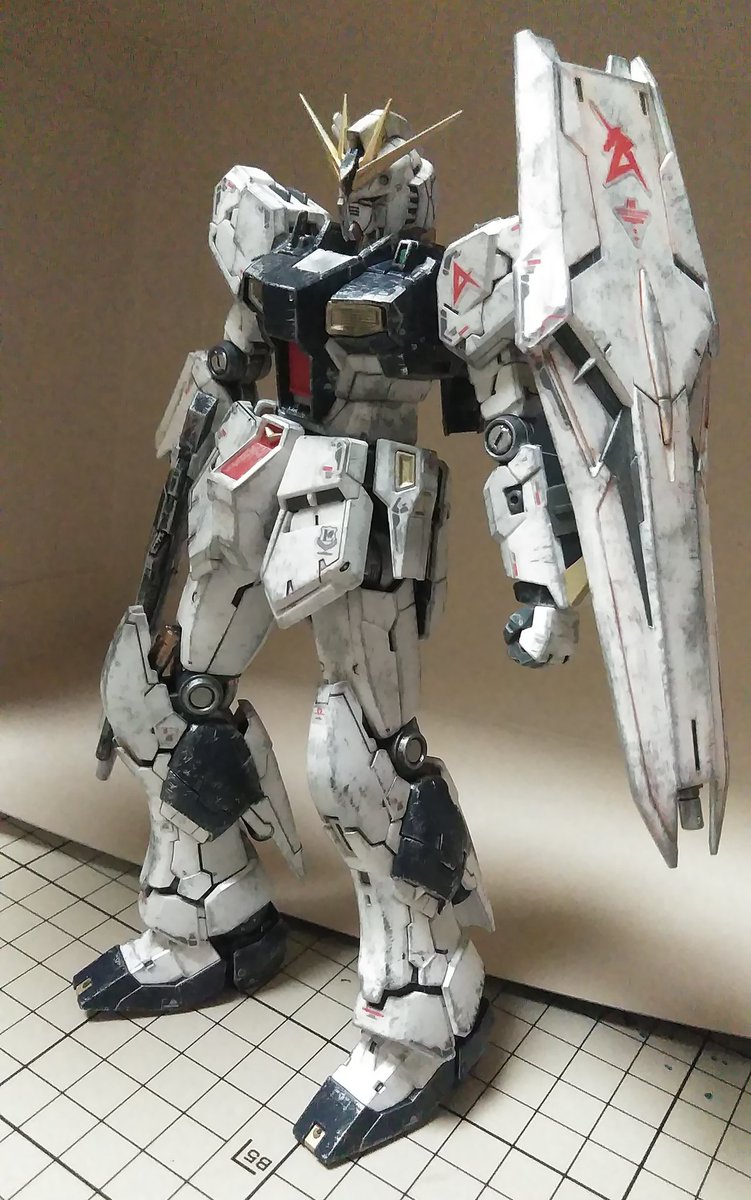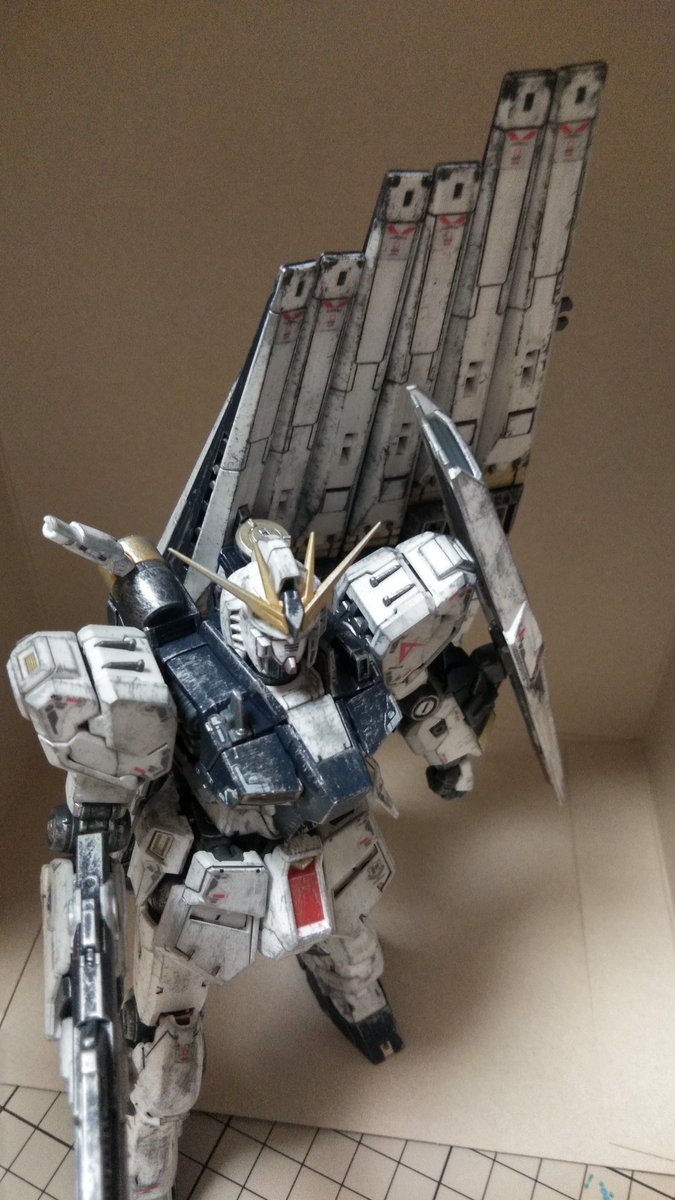 皆様今晩にゃ🎵😊 RGνガンダム完成です。 少々汚しすぎましたが石を押し出す前の死闘のあとです(笑) そのうちチタニウム作って比べます 少しは進化してるかな… #νガンダム #ガンプラの画像を貼るとRTされると聞いて