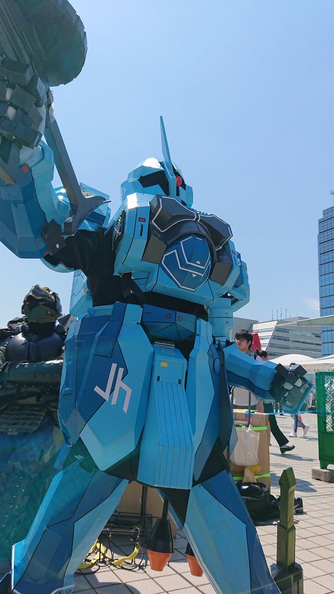 今年も居ましたMS枠。ヅダと、旧ザク?かな。スパイクシールドの汚しが歴戦感あって好き。 #C96 #C96コスプレ