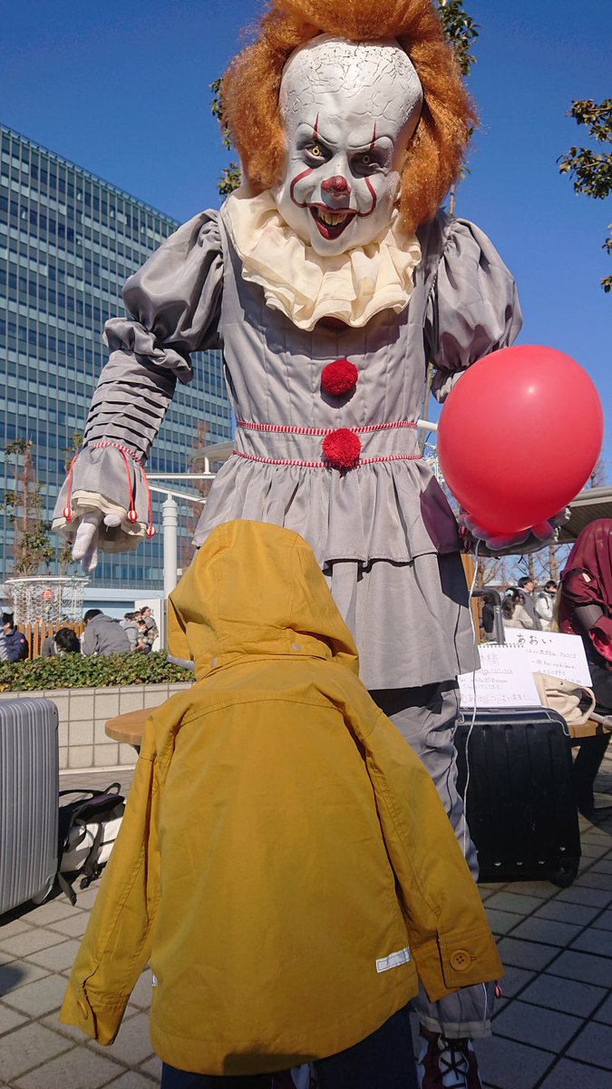 4 9 「ハァイ、ジョージ……」 クオリティの高すぎるペニーワイズさん。手前のジョージはお人形だが、ソロで世界観完璧とか誇らしくないの? #C97 #C97コスプレ 19/12/29 15:42