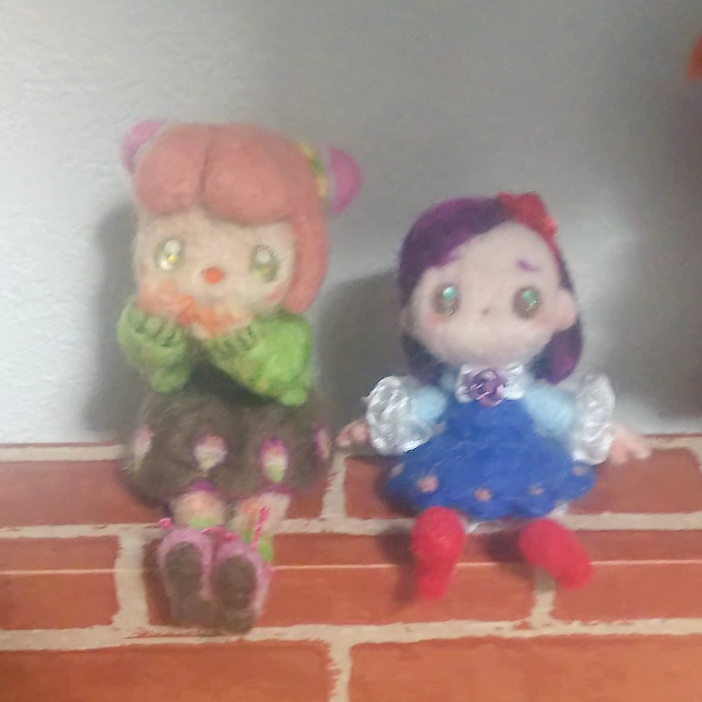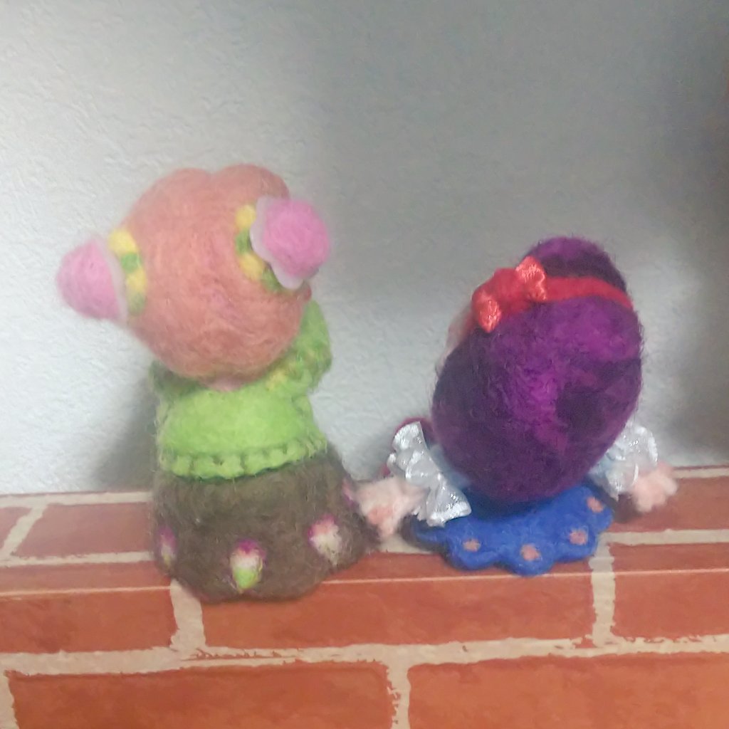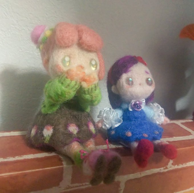 コツコツ作ってた女の子、完成しますた(左の子)。 前作った子と同じサイズで作る気だったのに比較したらちょっと大きくなってしまいました…。 春っぽい色を目指しました\( •̀ω•́ )/🌸 #羊毛フェルト