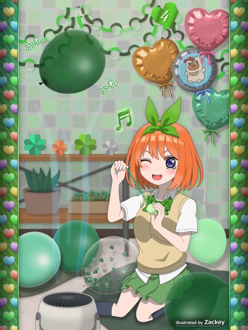 10 38 風船部屋をテーマに、ごと嫁イラスト描いてみた(四葉Ver.)💚 風船をサーキュレーターで浮かせて、ヘアゴムで落とそうとするよつばちゃんの様子🎈 #五等分の花嫁 #中野四葉 23/05/14 19:56