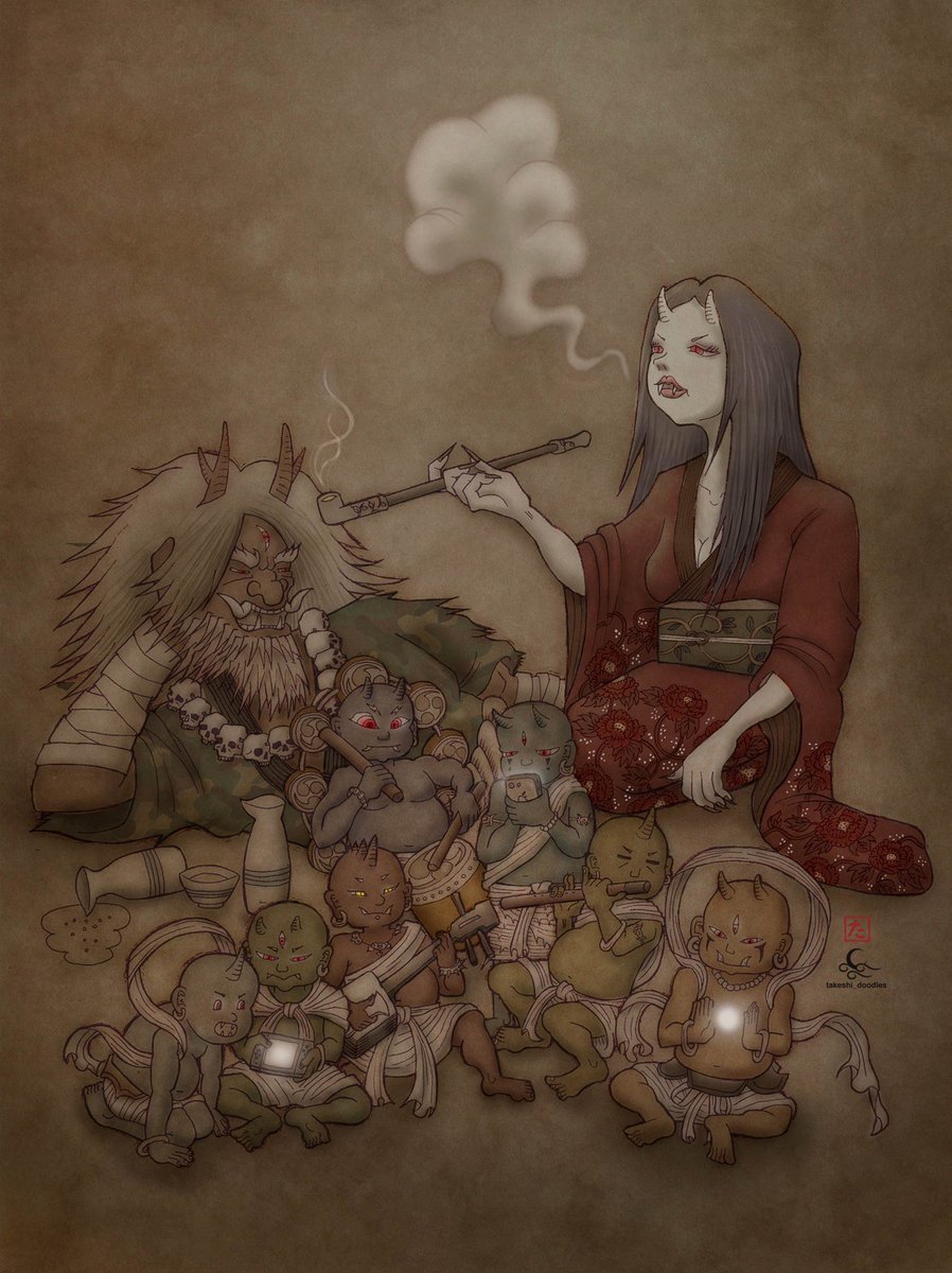 鬼の家族。ニュース見てると、家族でのんびり過ごせる時間に感謝だなぁと心底思います。 Rest of the oni's family. finished. I thank for time with my family. #イラスト #イラストレーション #絵 #鬼 #妖怪 #ドクロ #アート #drawing #draw #illustration #art