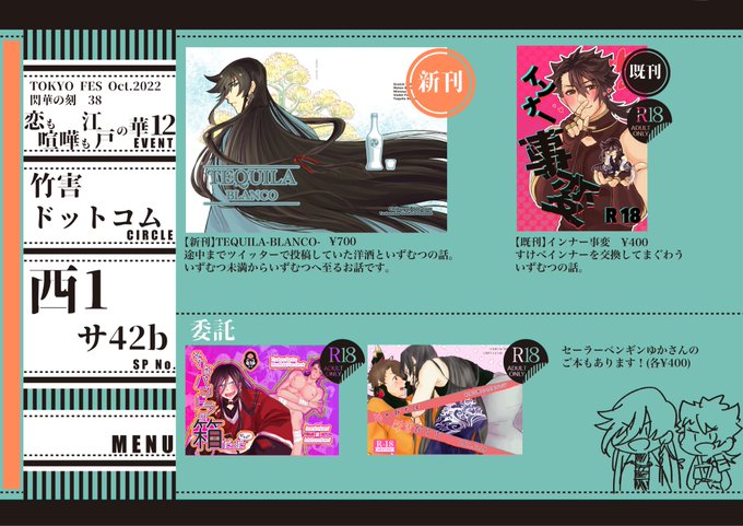 お恥ずかしながら頒布価格を書き忘れていたので再掲です… 私の新刊が¥700、既刊・委託共に会場価格¥400です! 通販はこれより少し割高になります。 💙新刊サンプル🧡 pixiv.net/artworks/98580… 💙既刊サンプル🧡 pixiv.net/artworks/93956…