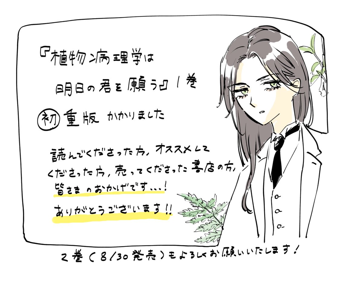 担当さんから嬉しい連絡がありました。重版です! 応援してくださった皆さまのおかげです!!💐💐 植物病理学の魅力、キャラクター達の魅力をたくさん描いていきたいです。これからもよろしくお願いいたします! #植物病理学は明日の君を願う #植物の君 読めます→bigcomics.jp/series/b300b7f…