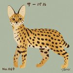 #100猫チャレンジ No.069「サーバル」 サーバルは、大きな耳と長い四肢、細身で筋肉質なボディが特徴。被毛は短毛で柔らかく美しい斑点模様をしている。ジャンプが得意で鳥や小型の哺乳類、バッタなどの大型の昆虫も捕食する。主な生息地・サハラ砂漠以南のアフリカ大陸 体重6~18kg サーバル属