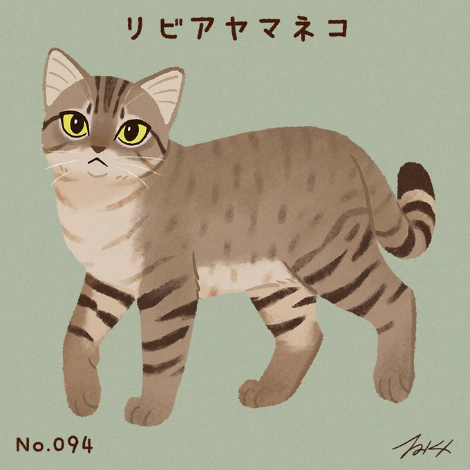 #100猫チャレンジ No.094「リビアヤマネコ」 リビアヤマネコは、イエネコの起源と言われている野生の猫。イエネコと比べて足が長く、歩き方に特徴がある。9000年以上前に家畜化された最初の猫と考えられている。主な生息地・アフリカ、アラビア半島など。体重3~8kg ネコ属