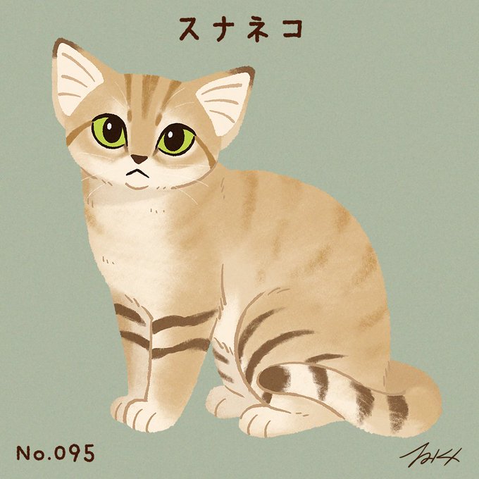 #100猫チャレンジ No.095「スナネコ」 スナネコは、「砂漠の天使」ともいわれ、砂漠や砂丘に生息している野生の猫。耳介が大きく、内側は長い毛で被われているので砂の侵入を防ぐことができる。主な生息地・アラブ首長国連邦、エジプト、サウジアラビアなど。体重1.35~3.4kg ネコ属